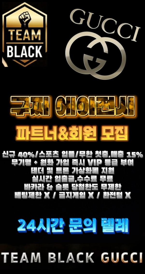 ✨️각종 혜택 챙김 케어 1위 구찌 에이전시 - 파트너 & 회원 모집 - ✨신규 40%/스포츠 입플/무한 첫충/매충 15% - 업계 최대 혜택 --- ???? 먹튀 걱정은 이제 NO! - 100% 안전 보장 - 대한민국 1등 안전 ?